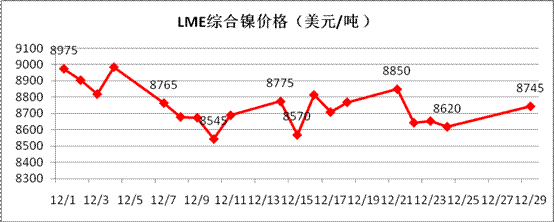 對(duì)于來(lái)年1月份走勢(shì)判斷,從技術(shù)面看,倫鎳在未站穩(wěn)8800美元/噸以上時(shí),市場(chǎng)仍舊存在下跌至8100美元/噸一線的風(fēng)險(xiǎn),甚至存在創(chuàng)新低的可能。從基本面看,倫鎳庫(kù)存依舊高位,表面看市場(chǎng)供應(yīng)繼續(xù)充足,但從中國(guó)進(jìn)口精煉鎳、鎳鐵的量來(lái)看,并未呈現(xiàn)繼續(xù)增加的態(tài)勢(shì),可見實(shí)際國(guó)外供應(yīng)量已基本接近現(xiàn)有峰值,國(guó)內(nèi)將進(jìn)入去庫(kù)存化周期,對(duì)于鎳市短期而言弱勢(shì)盤整是主流。