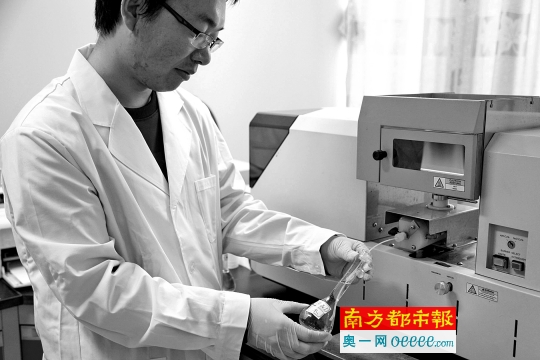 4 .程工正在使用原子吸收設備檢測水樣品。