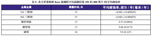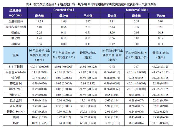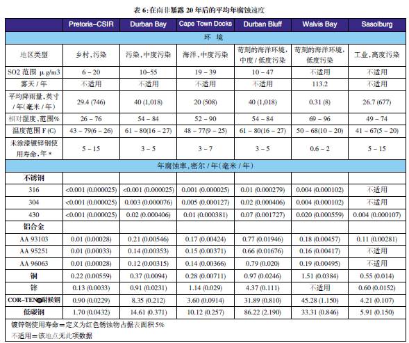 表3至表6的數(shù)據(jù)來(lái)自于日本、巴拿馬、Kure 海灘(北卡萊羅納州)和南非的試驗(yàn)地點(diǎn)。可利用這些數(shù)據(jù)在類(lèi)似環(huán)境中選擇適當(dāng)?shù)慕饘俨牧?,進(jìn)行生命周期成本分析。