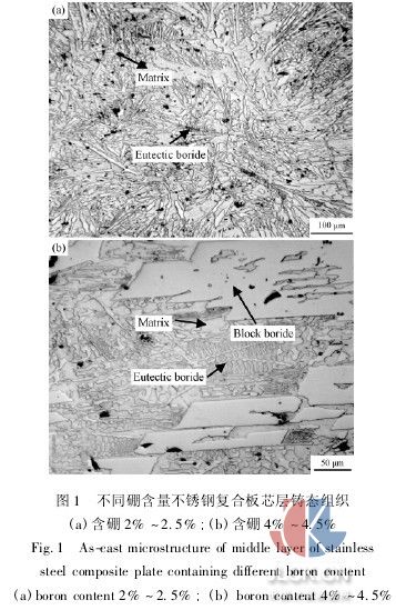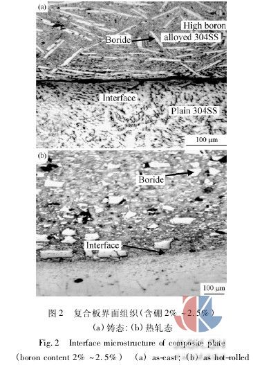 采用10kg真空熔煉爐在0.1kpa的真空條件下熔煉并澆鑄出3種不同硼含量的高硼不銹鋼芯料,將芯料置于澆鑄模內(nèi),從鑄模的上澆口中澆入作為覆層的普通不銹鋼,使之包覆在芯料周圍,制備出尺寸為120mm×100 mm×80mm,硼含量分別為2.0%~2. 5%、3.0%~3.5%、4.0%~4.5%的復(fù)合材料坯料。包覆澆鑄后的坯料在1150℃下經(jīng)過鍛造及350型可逆熱軋機(jī)上的熱軋變形,軋制成最終厚度為3mm左右的不銹鋼復(fù)合板。軋制變形時(shí),最初2道次的壓下量為20%~30%,使鑄態(tài)組織充分破碎,隨后壓下量降低至15%左右,每4~5個(gè)道次回爐重新加熱。