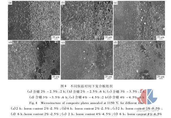 的規(guī)律,但硼化物經(jīng)過初步的粗化以后,在保溫過程中基本是穩(wěn)定存在的。盡管含硼不銹鋼復(fù)合板屏蔽熱中子的性能隨著含硼量的增加而提高,但過高的硼含量使組織中出現(xiàn)難以通過熱軋變形而破碎的大塊狀過共晶組織。因此,從高硼不銹鋼復(fù)合板力學(xué)性能及防氧化考慮,硼含量控制在3%以內(nèi),擴(kuò)散退火時(shí)間控制在2h左右為宜。