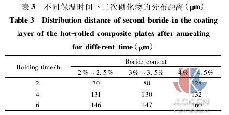 結(jié)合圖4、表3可以看出,隨著芯層硼含量的升高,同樣保溫時(shí)間下二次硼化物的分布距離增加,但這種變化的程度并不大。這是由于,一方面,隨著硼含量的增加,芯層中細(xì)小的共晶硼化物以及二次硼化物的數(shù)量是明顯增加的。這些硼化物可能隨著硼原子的擴(kuò)散,部分溶解到基體中,因此有利于擴(kuò)散的進(jìn)行。另一方面,過共晶硼化物在保溫過程中基本不會(huì)出現(xiàn)局部向基體中溶解的過程。在硼原子從界面向覆層的擴(kuò)散過程中,基本上不受到中間層組織中的過共晶硼化物的影響。所以,硼原子的擴(kuò)散速率隨著中間層硼含量的增加而變化的程度不大。