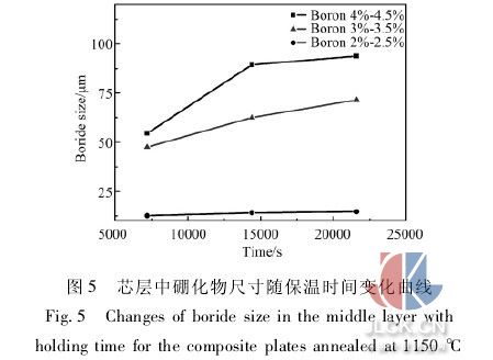 復(fù)合澆鑄過程中芯層與覆層界面處的間隙通過大變形量的熱軋變形完全可以實(shí)現(xiàn)冶金結(jié)合。擴(kuò)散處理過程中硼原子在界面附近的擴(kuò)散速率很低并且隨著中間層硼含量的增加變化的程度不大。隨著保溫時(shí)間的延長,硼原子的擴(kuò)散距離也在增加,但其擴(kuò)散速率是逐漸降低的。雖然硼化物在保溫過程中的粗化行為近似滿足